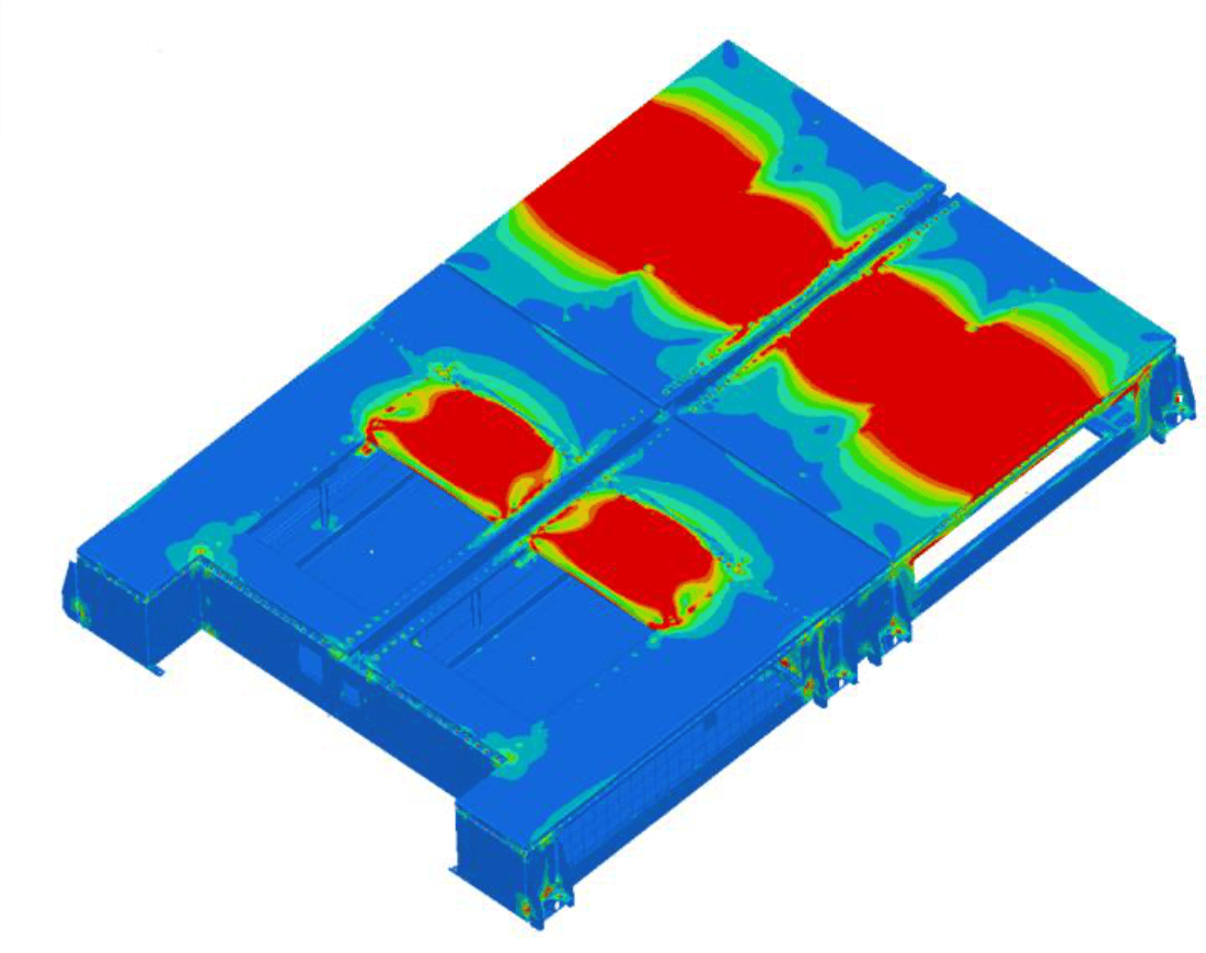 Schienenfahrzeuge haben in der Regel nur begrenzten Platz für das Klimaanlagengehäuse, daher ist eine methodische Gewichtsoptimierung des strukturellen Teils des Klimaanlagengehäuses erforderlich. Das Klimaanlagengehäuse, Trennwände, Halterungen, Rohre und Luftkanäle werden im Hinblick auf eine beanspruchungsoptimierte Neukonstruktion optimiert. Verbesserte strukturelle Lastpfade, Aktivierung von Scherfeldern und Laststufenkonzepte werden umgesetzt. Das Strukturgewicht konnte um ca. 30 % reduziert werden.