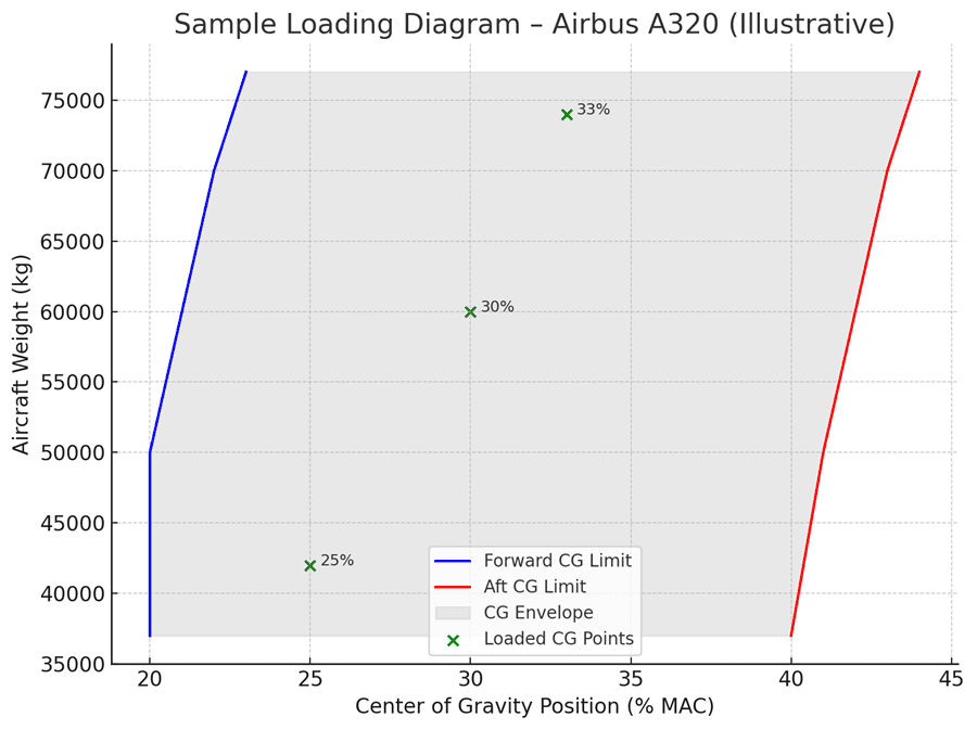 Ein Belastungsdiagramm ist ein grafisches Werkzeug, das zur Berechnung des tatsächlichen Schwerpunkts (Center of Gravity, COG) und des Gewichts eines Flugzeugs basierend auf den Beladungsbedingungen verwendet wird. Es ist ein entscheidendes Instrument, um sicherzustellen, dass das beladene Flugzeug innerhalb der zulässigen COG-Grenzen liegt, was für einen sicheren Flugbetrieb unerlässlich ist.
